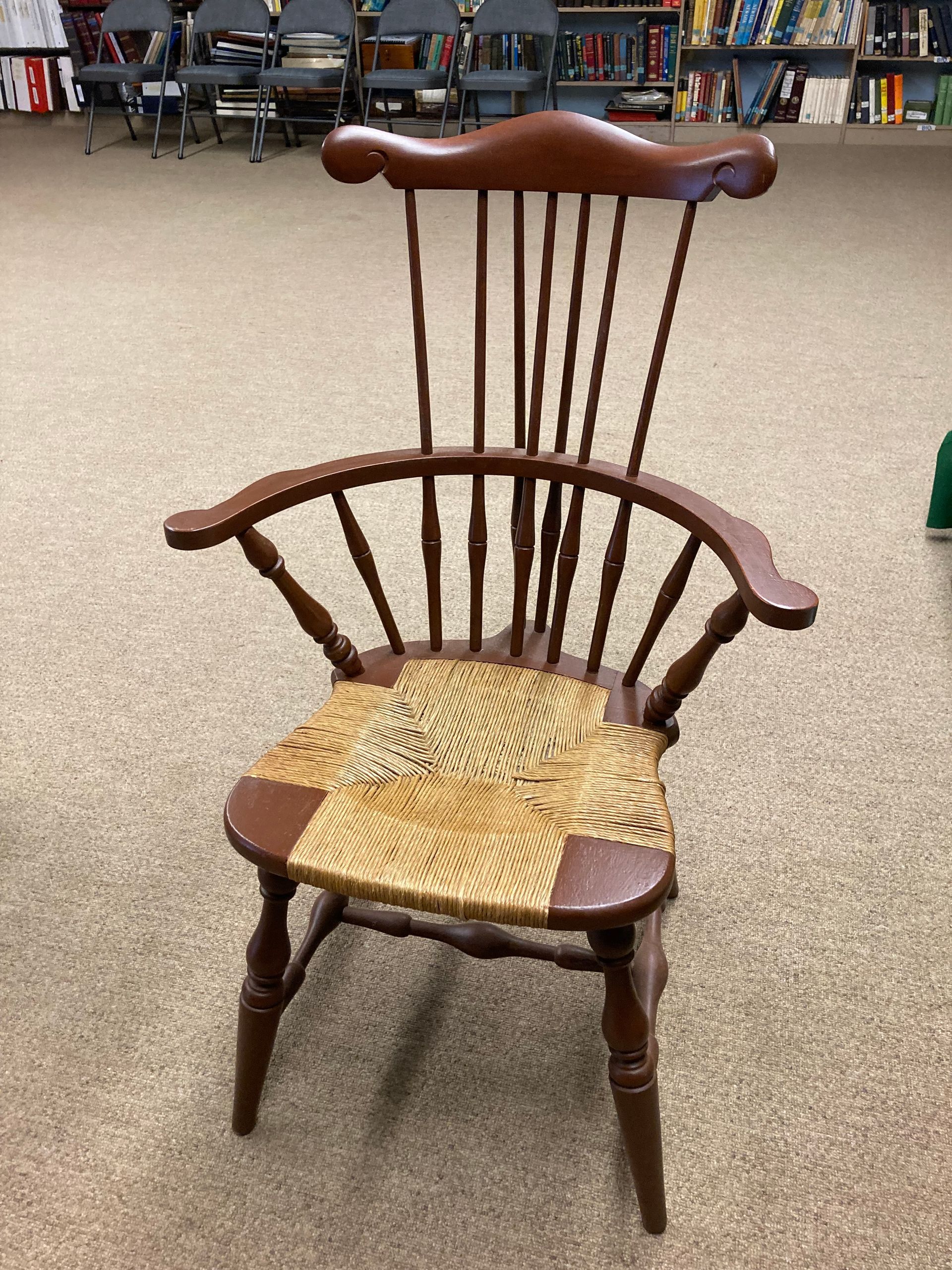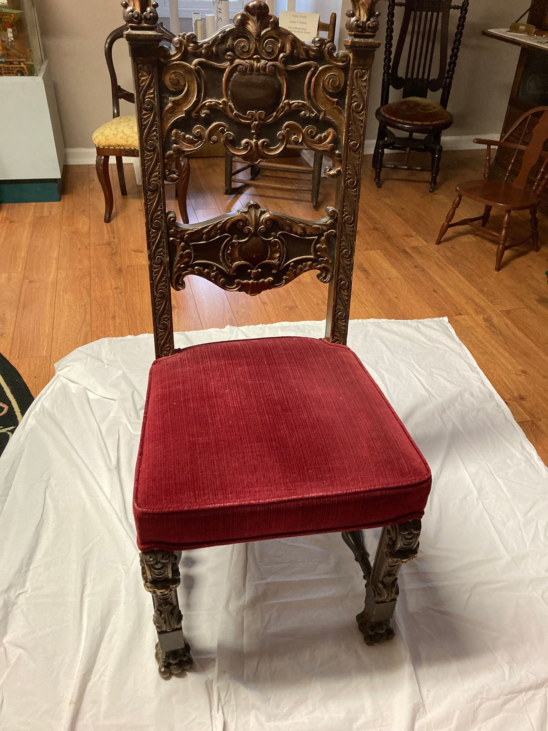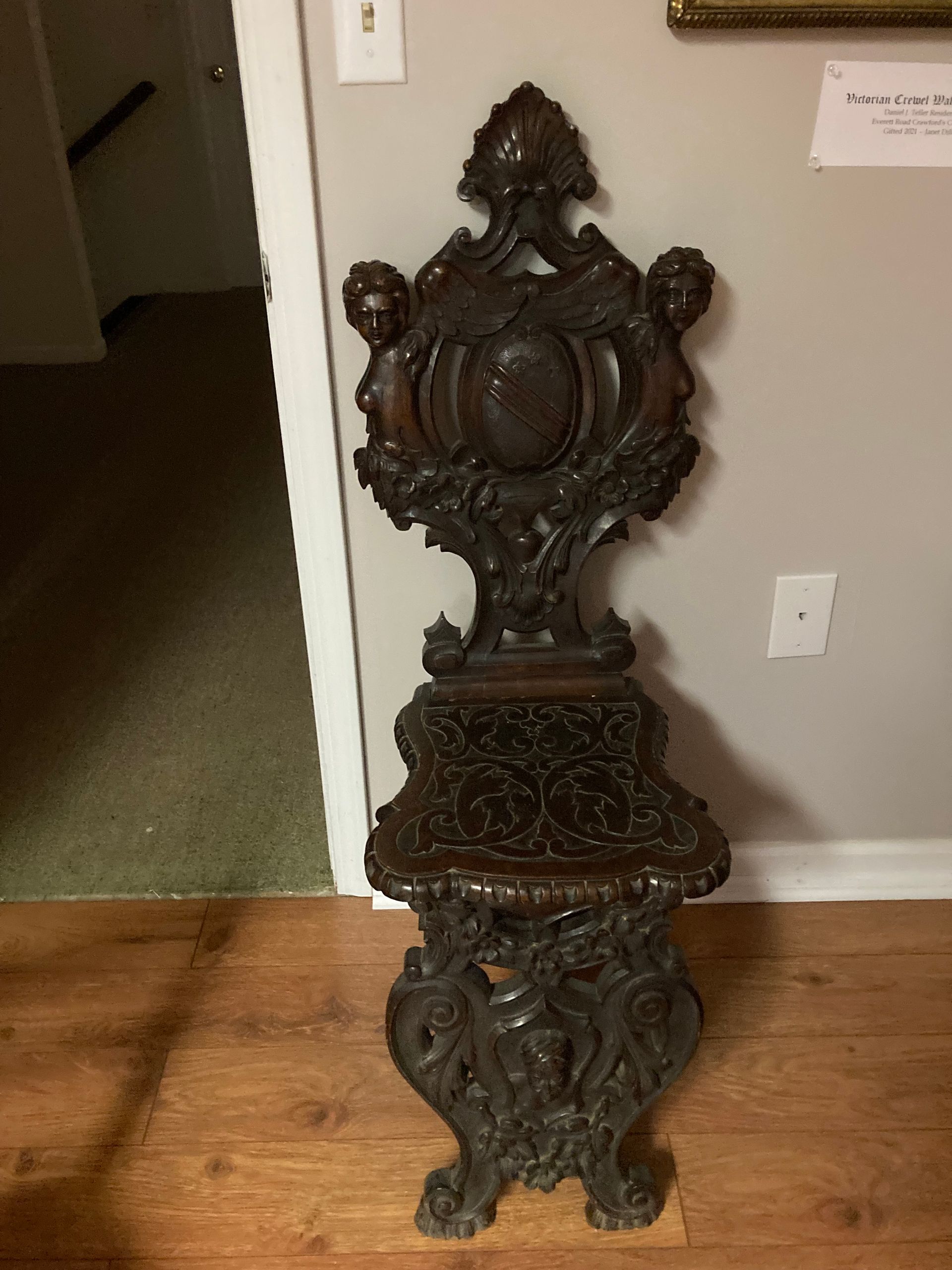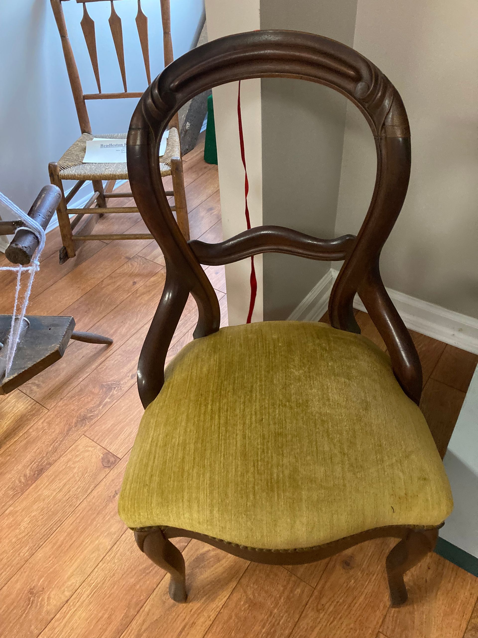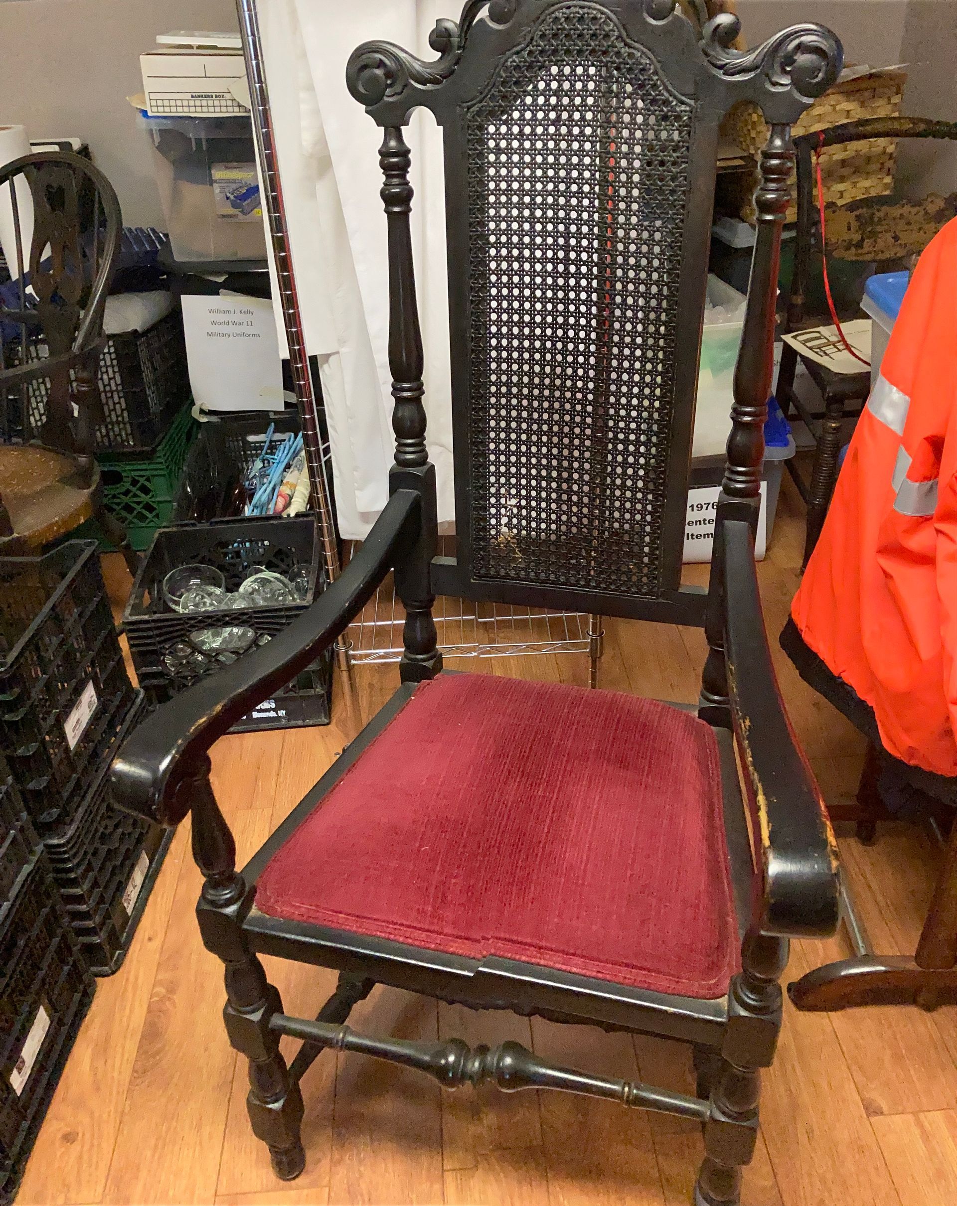 George LaFante, a noted local furniture craftsman, provided the fabric and the labor to reupholster it in rich burgundy velvet. In 2022, the chair was again reupholstered by SHS lifetime members, Judi and Stuart Buncher.