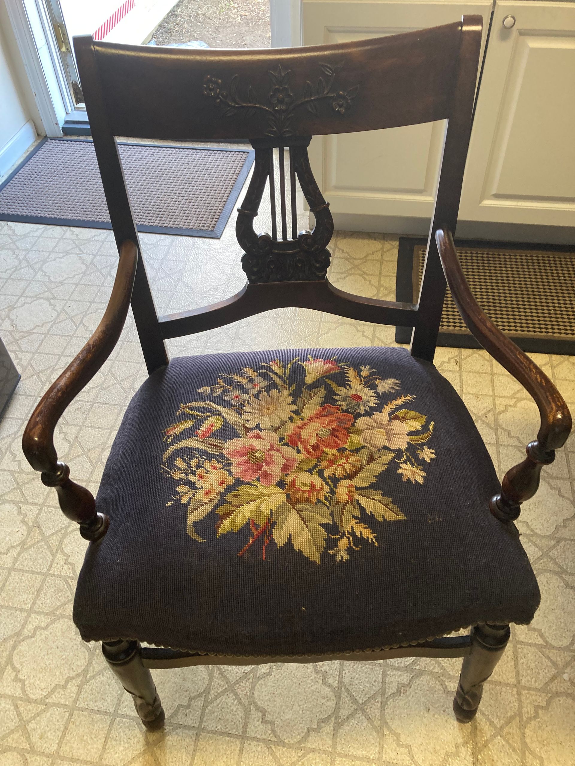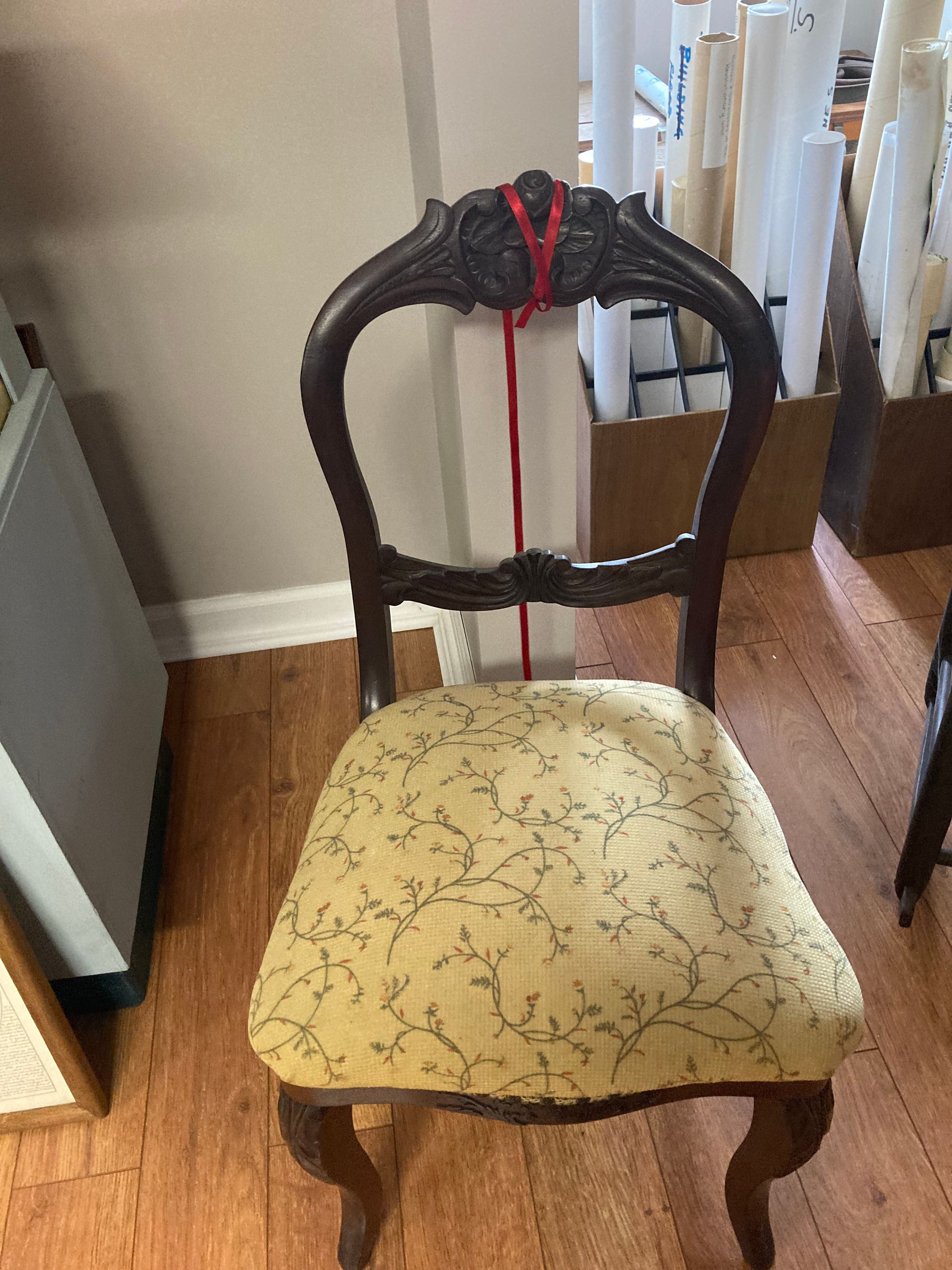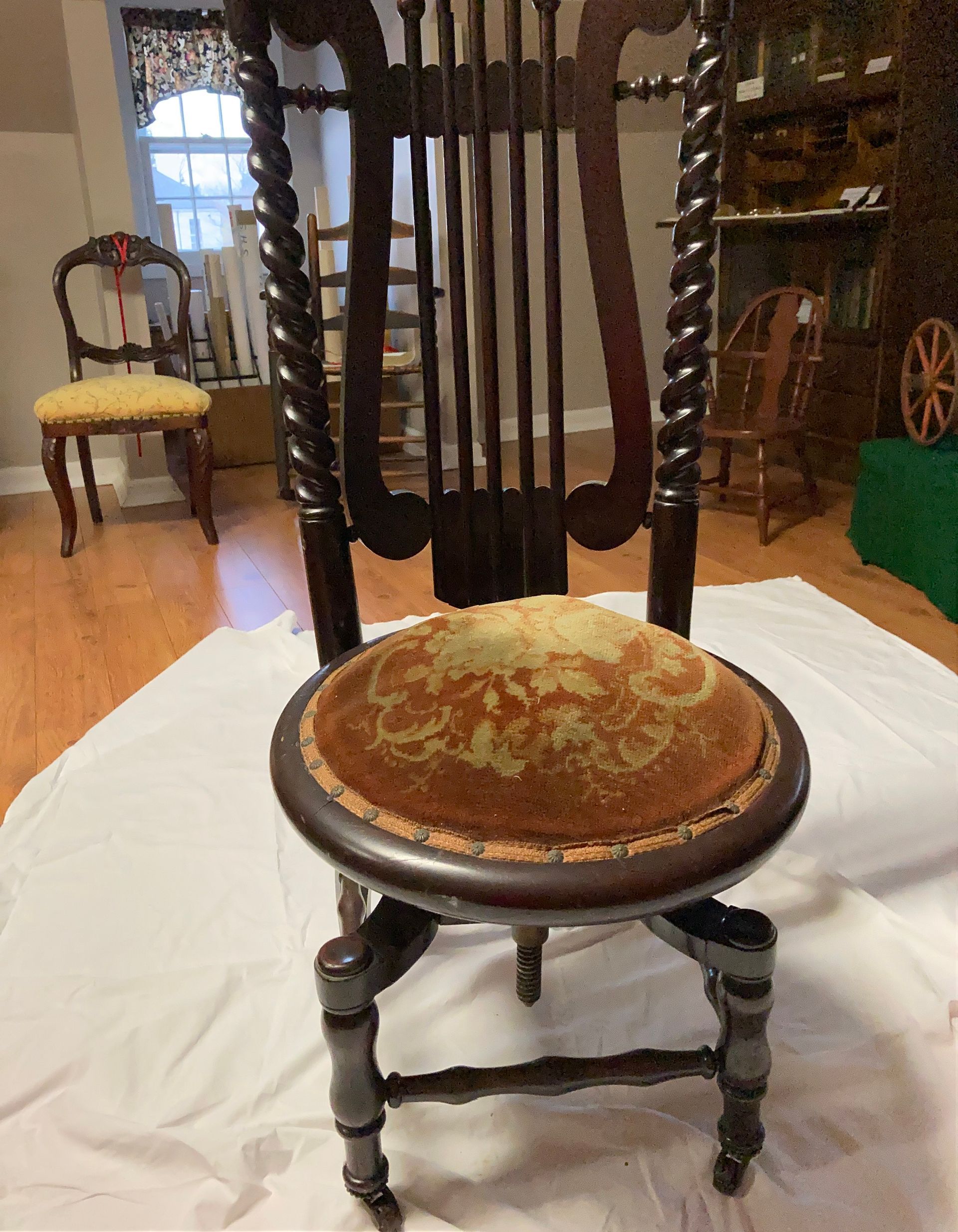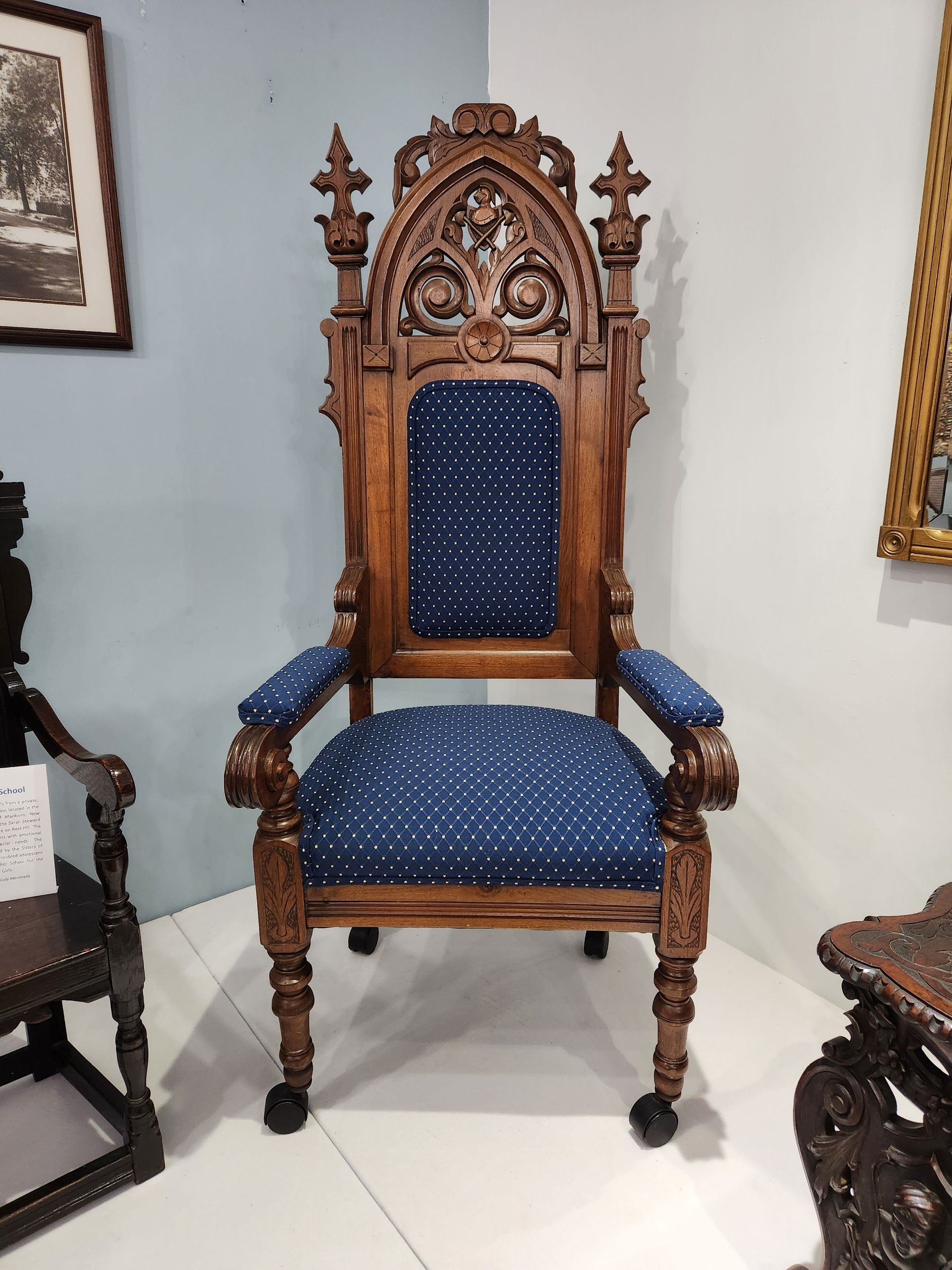 George LaFante, a noted local furniture craftsman, provided the fabric and the labor to reupholster it in rich burgundy velvet. In 2022, the chair was again reupholstered by SHS lifetime members, Judi and Stuart Buncher.