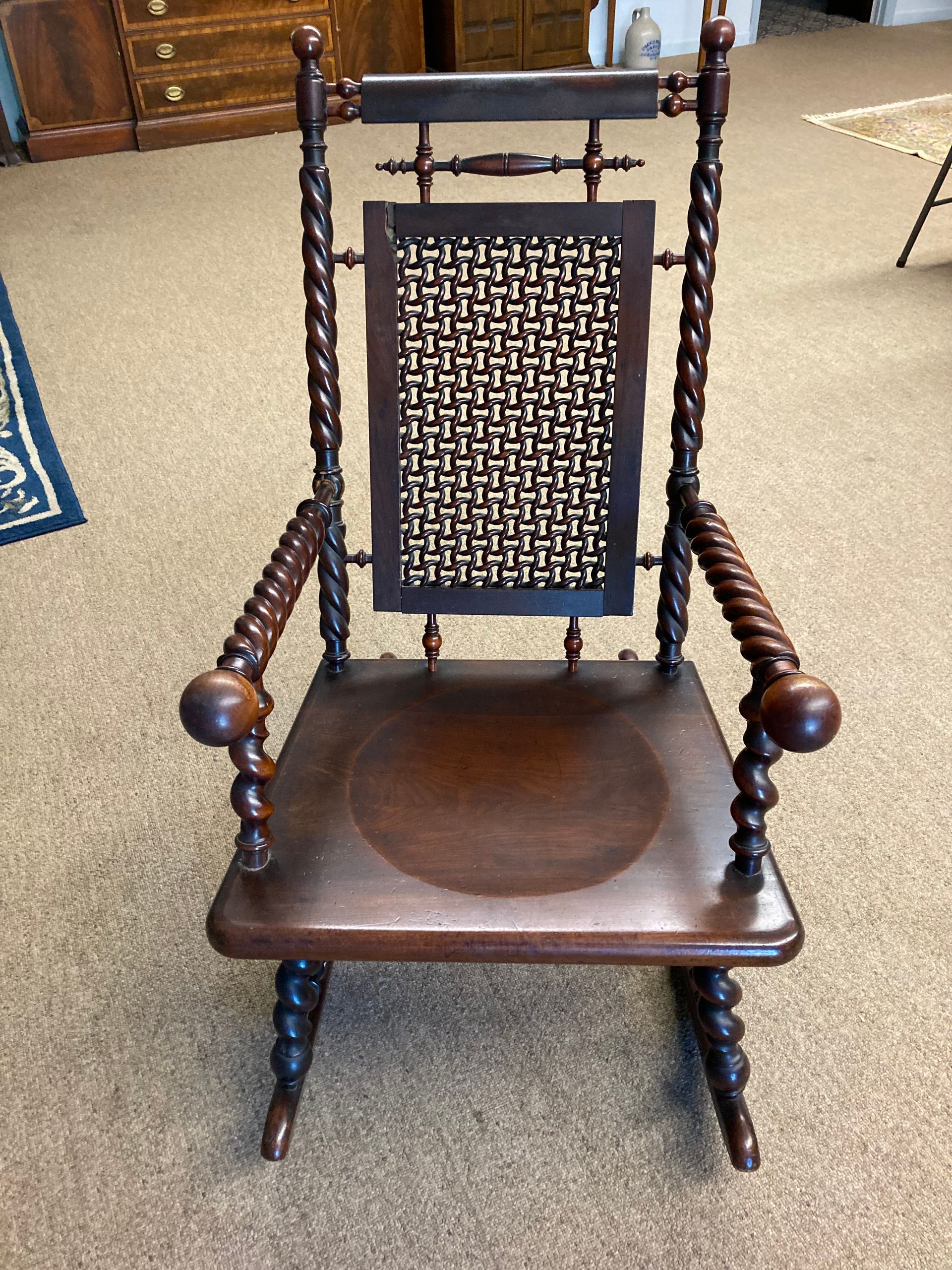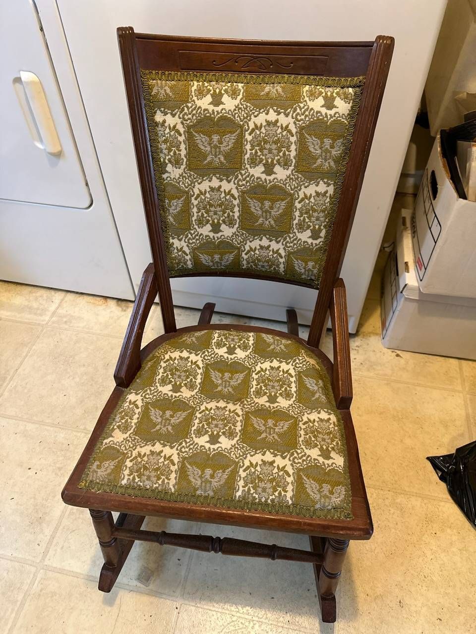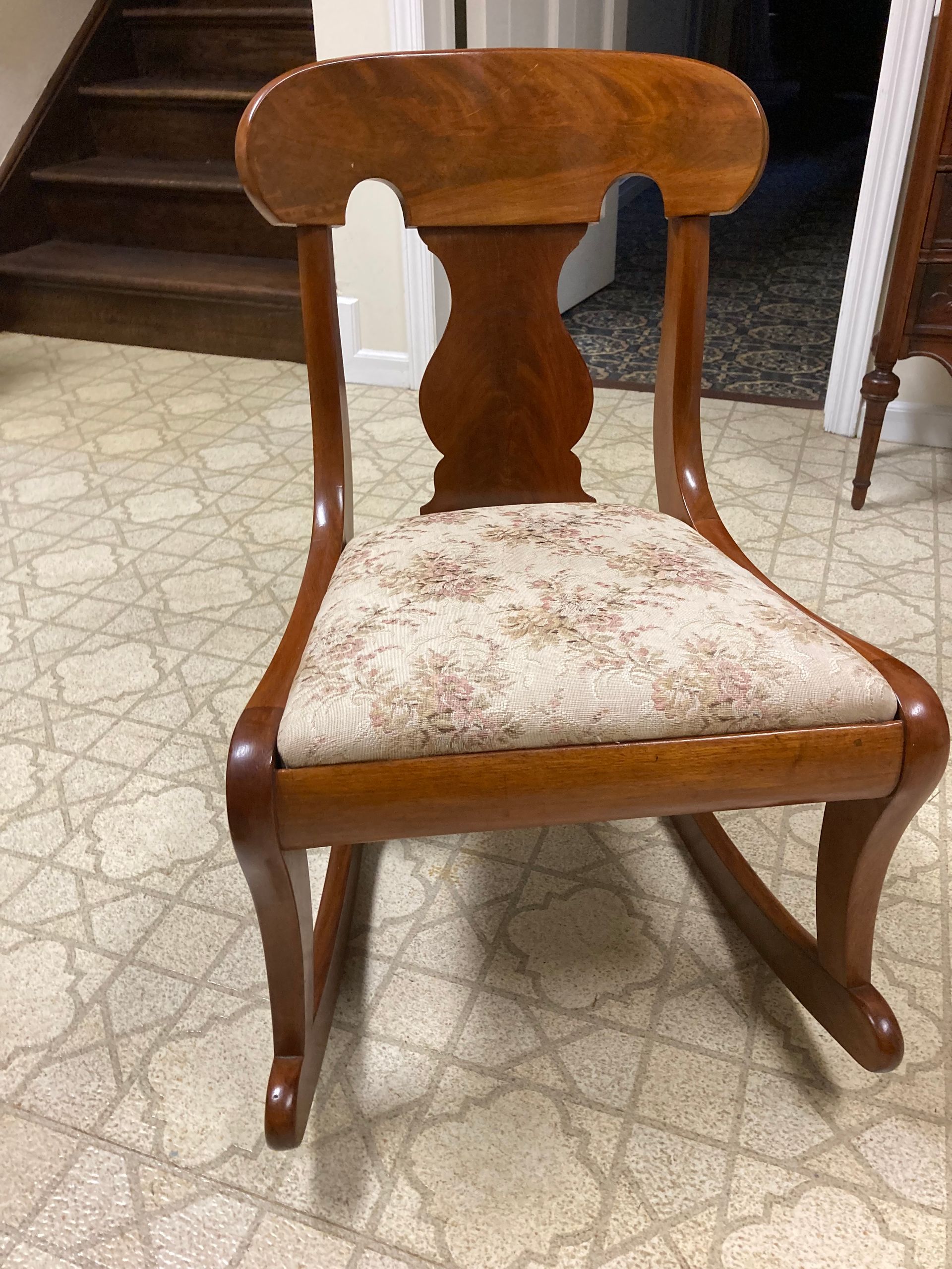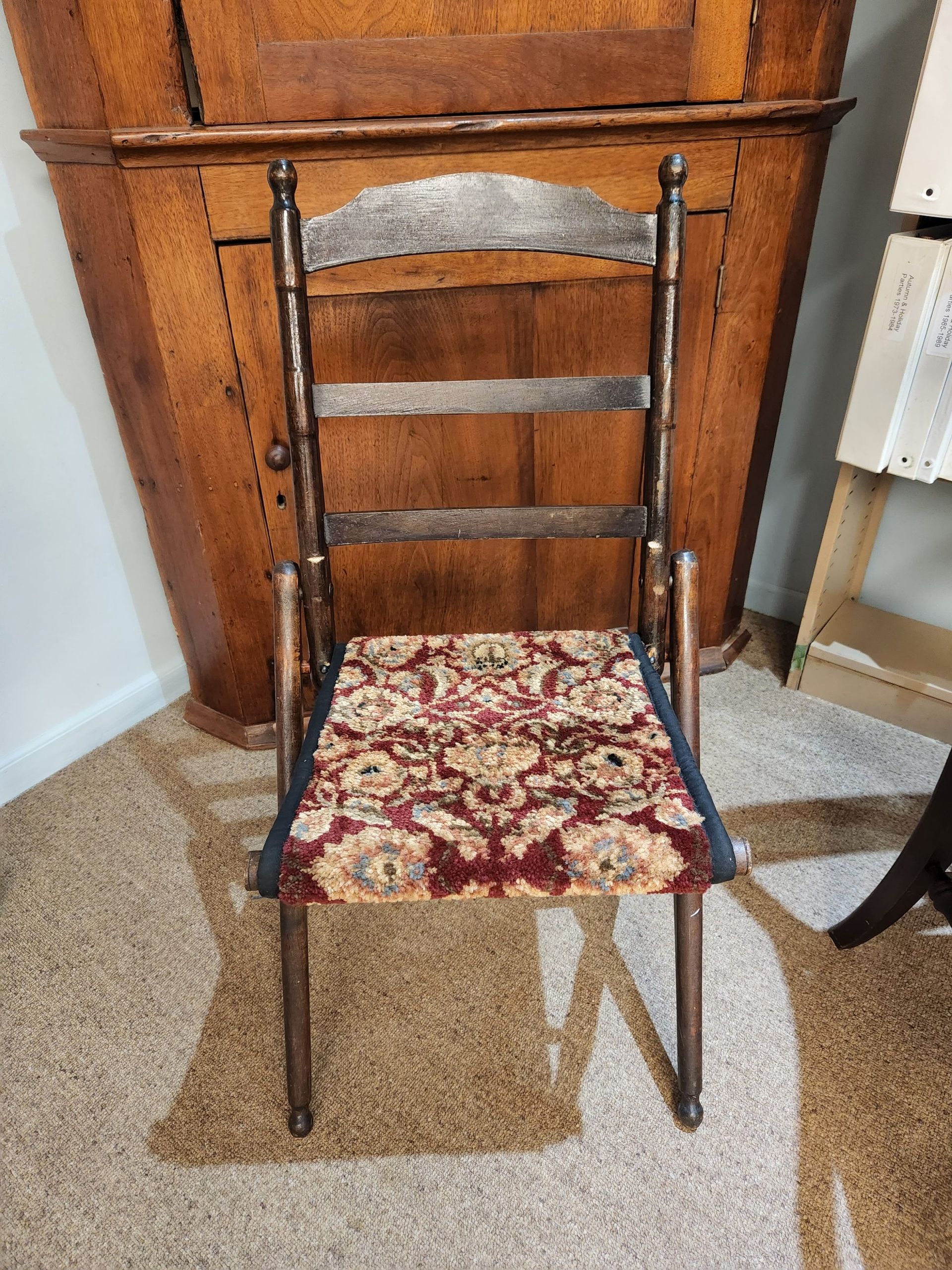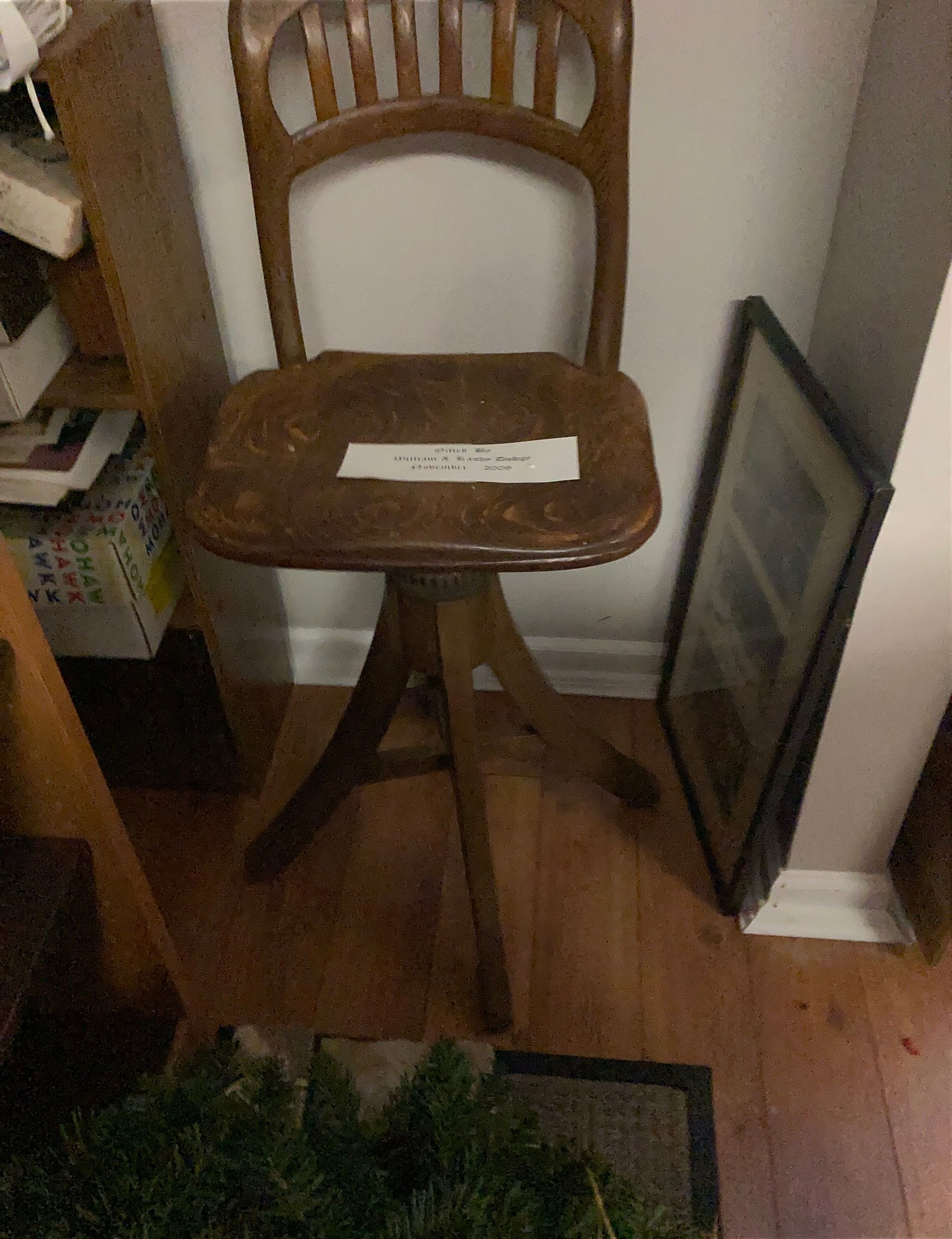 George LaFante, a noted local furniture craftsman, provided the fabric and the labor to reupholster it in rich burgundy velvet. In 2022, the chair was again reupholstered by SHS lifetime members, Judi and Stuart Buncher.